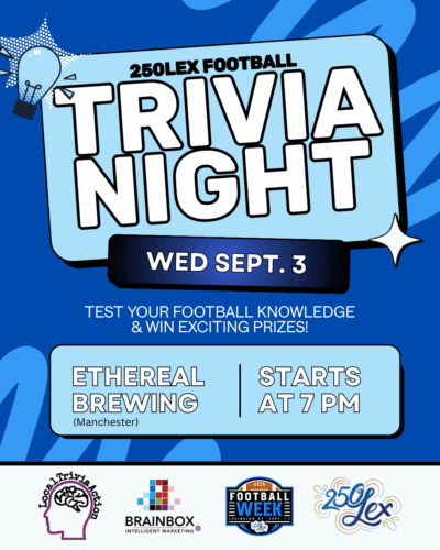 BRAINBOX hosted the 250Lex Trivia Night at Ethereal Brewing in the distillery district! Multiple teams showcased their Lexington Football knowledge to win prizes like t-shirts, stickers, and custom 250Lex shot glasses. One lucky raffle winner won 2 tickets to the UK vs Ole Miss football game!